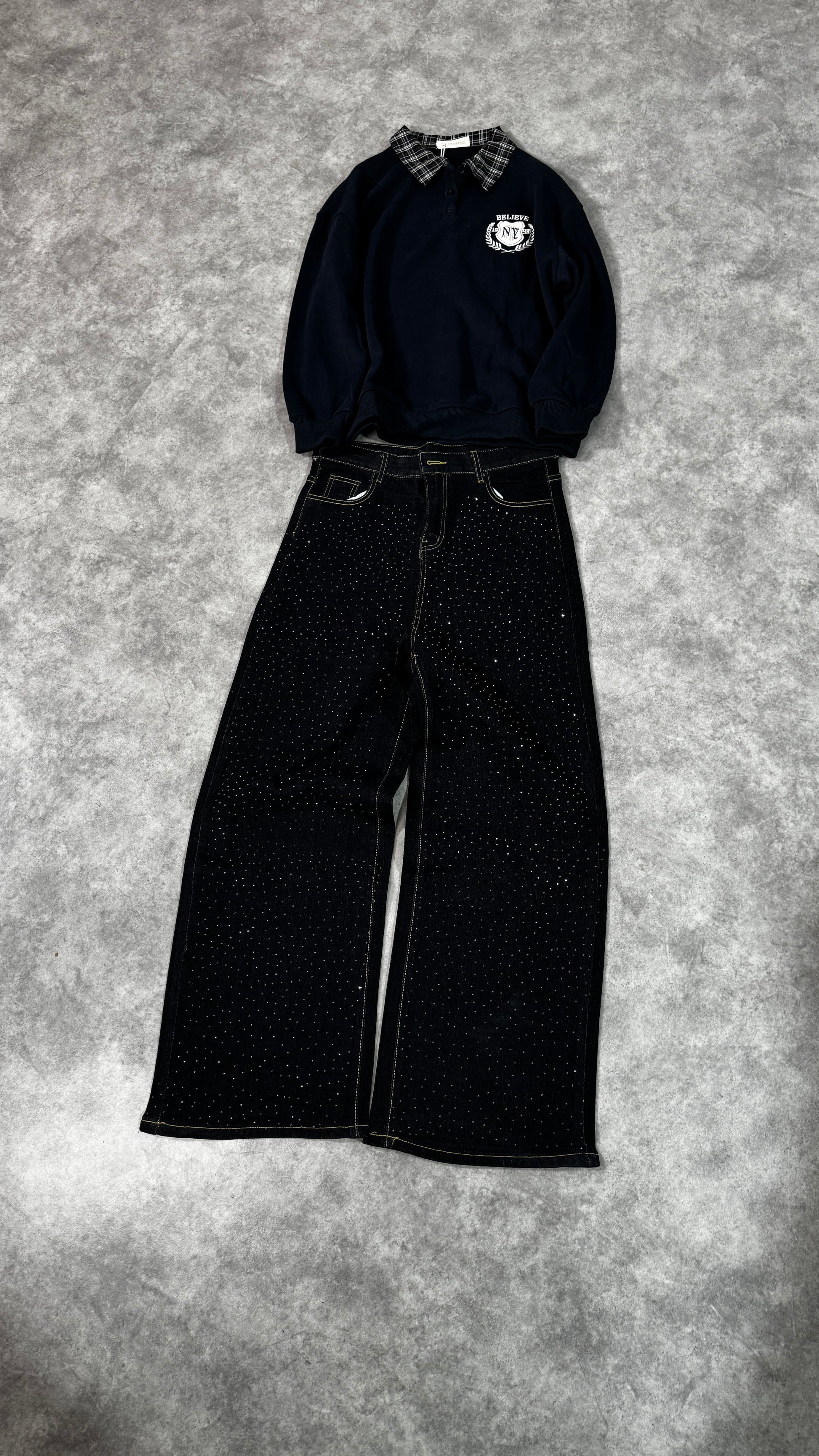 جينز بقصة واسعة بتصميم عصري يمنح إطلالة ستريت ستايل مميزة.
